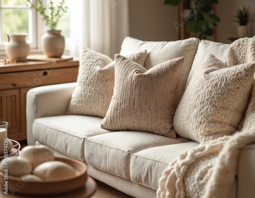 Cozy living room interior. Comfy sofa holds textured cushions, soft knit blanket. Natural light fills space from window. Warm neutral tones create relaxing home atmosphere. Wooden furniture, decor
