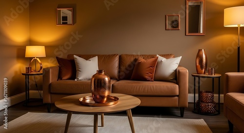interior, living, room, sofa, leather, furniture, home, decor, design, cosy, warm, lighting, lamp, table, pillow, cushion, copper, vase, round, hot drink, rug, carpet, wall, brown, beige, comfortable, modern, style, elegant, space, indoor, lifestyle, apartment, house, residential, detail, arrangement, aesthetic, inviting, relaxing, peaceful, calm, atmosphere, ambience, contemporary, stylish, luxury, minimalist, clean