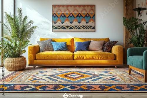 sofa, cushion, rug, art, wall, plant, texture, colours, design, comfort, home, interior, style, furniture, aesthetic, modern, cosy, warmth, seating, arrangement, light, wood, pattern, space, atmosphere, relaxation, decor, vibrant, accessory, chic, inviting, contemporary, natural, ambience, pattern, throw, pillow, greenery, woven, living, area, layout, artistic, homelike, charme, visual, attracted