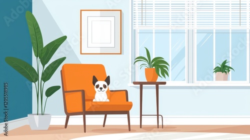 cosy, living room, furniture, pet, dog, armchair, indoor, home, decor, plant, houseplant, sunlight, window, comfortable, orange, minimalism, style, design, relaxation, nature, warmth, cheerful, cute, illustration, modern, background, interior, space, bright, vibrant, atmosphere, creative, artistic, natural light, tidy, inviting, simple, character, comfort