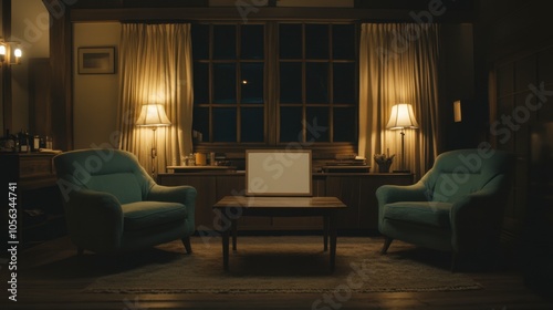 living room, furniture, chair, table, lamp, curtain, interior, home, cosy, night, lighting, warmth, decor, ambient, shadow, design, comfort, relaxation, atmosphere, empty, window, decorative, scene, peaceful, calm, soft, space, evening, structure, residential, modern, architecture, minimalist, stillness, room, inviting, stylish, traditional, ambience, lifestyle, nostalgia, retreat, calmness, simplicity