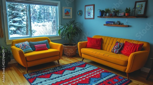 sofa, living room, yellow, winter, window, view, cosy, room, interior, design, home, decor, comfort, furniture, cushion, pillow, rug, carpet, plant, potted, shelf, wall, blue, wood, floor, snow, tree, house, apartment, modern, rustic, style, aesthetic, relax, peaceful, calm, serene, homely, warm, comfortable, inviting