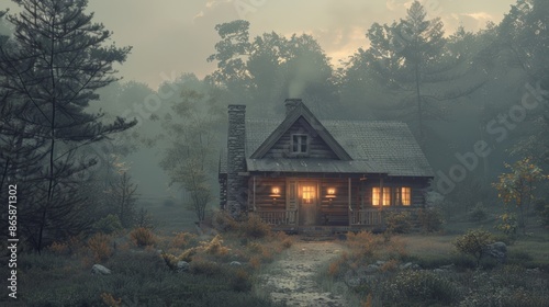 Cozy log cabin in a foggy forest clearing with warm glowing lights, creating a serene and tranquil atmosphere during dusk.