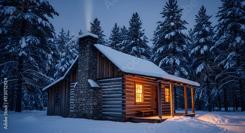 Cozy Log Cabin in Snowy Forest at Dusk with Warm Interior Light