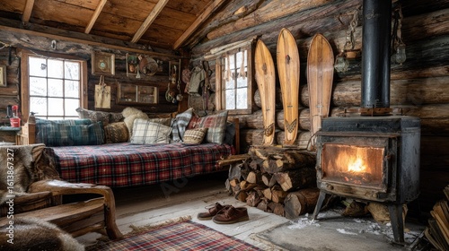 Cozy log cabin interior, wood stove, blankets, skis