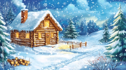 Cozy log cabin nestled in a snowy forest at night. Warm light emanates from the cabin, surrounded by snow-covered trees and a path.