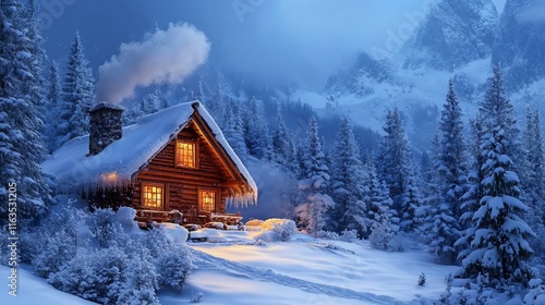 Cozy log cabin nestled in a snowy mountain valley at twilight. Warm light from the windows illuminates the winter wonderland.
