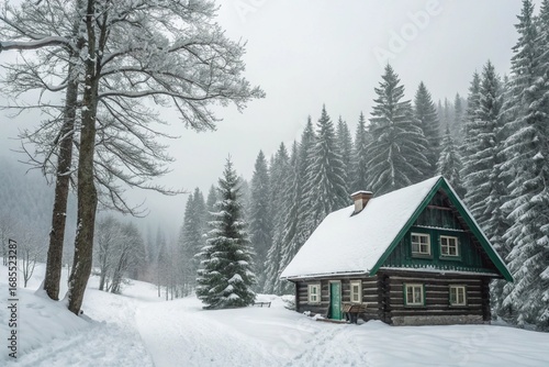 winter, snow, cabin, log, forest, tree, pine, landscape, nature, outdoors, secluded, remote, peaceful, tranquil, serene, idylli, rural, countryside, scene, cold, weather, season, holiday, christmas, cosy, warmth, shelter, architecture, building, wood, path, trail, scenic, wonderland, snowfall, frosty, evergreen