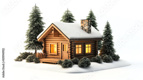 Cozy log cabin with snow-covered roof and glowing windows surrounded by pine trees on a snowy white background.