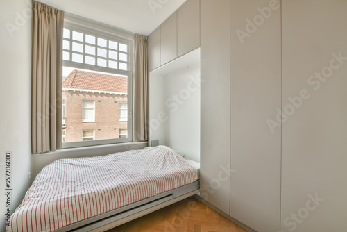 bedchamber, minimalist, window, natural light, cosy, interior, home, design, simplicity, modern, furniture, wooden floor, curtain, daylight, residential, space, comfort, decoration, style, architecture, living, fabric, wall, apartment, indoor, living space, urban, house, decor, contemporary, beige, building, pane, clothes rack, pillow, sheet, elegance