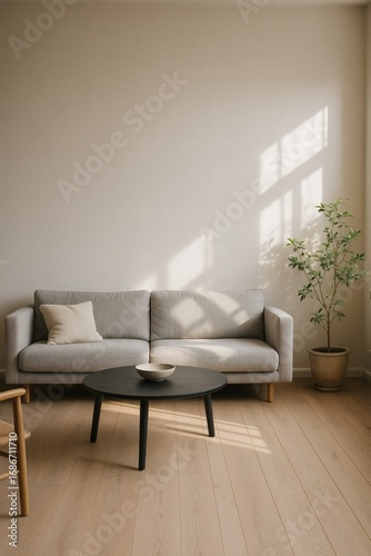 Cozy minimalist living room with gray sofa, black round coffee table, and indoor potted plant.