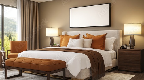 bedchamber, interior, cosy, modern, decor, natural light, furniture, design, home, comfort, relaxation, curtain, bedding, cushion, lamp, window, nature, style, aesthetic, architecture, clean, sophisticated, minimalist, serene, peaceful, contemporary, luxury, warm tones, orange, earth-tone, inviting, seating, hardwood