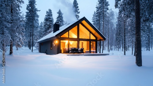 Cozy modern cabin in snowy forest landscape with warm glow and tall pine trees during winter evening dusk