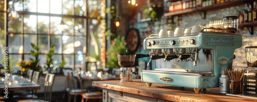 Cozy Modern Cafe Interior with Vintage Espresso Machine and Sunlit Windows