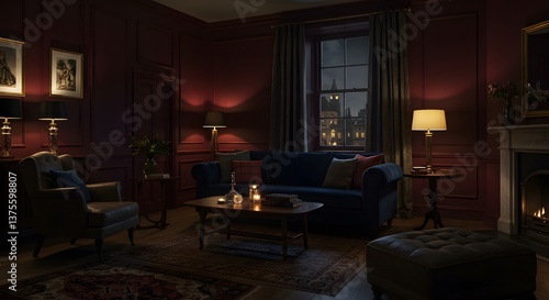 living room, night, cosy, interior, room, home, apartment, house, furniture, sofa, comfortable, relaxing, evening, dark, lamp, fireplace, window, city view, night view, candle, book, armchair, elegant, luxurious, sophisticated, vintage, classic, style, design, decor, home decor, interior design, peaceful, quiet, tranquil, serenity, calm, atmosphere, ambience, mood, experiencing, luxury, rich, burgundy, dark red, deep red