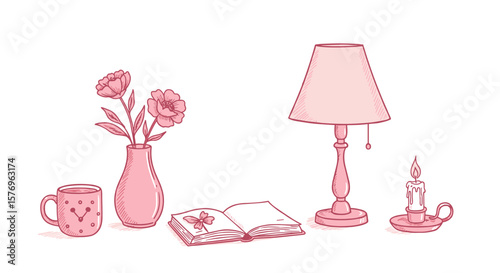 Cozy pink room decor with flowers, open book, and lamp in sketch style