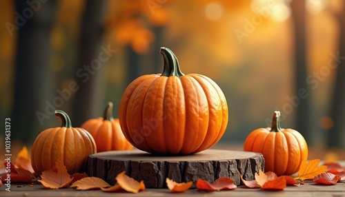 Cozy pumpkin and fall leaves enhance a Halloween-themed product display podium perfect for seasonal branding ideas.