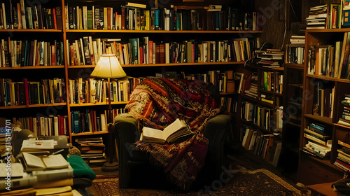Cozy reading chair in a book-filled library at night; peaceful study atmosphere, ideal for education or relaxation concepts