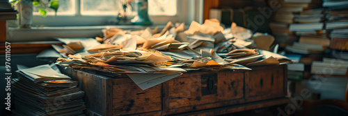 Cozy Rustic Office with Piles of Paperwork and Vintage Wooden Desk