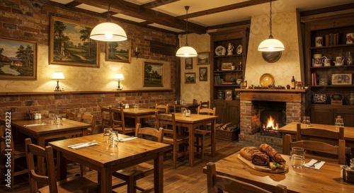 Cozy Rustic Restaurant Interior - Warm, inviting restaurant with wooden tables, brick walls, and a fireplace. Perfect for a casual meal or gathering