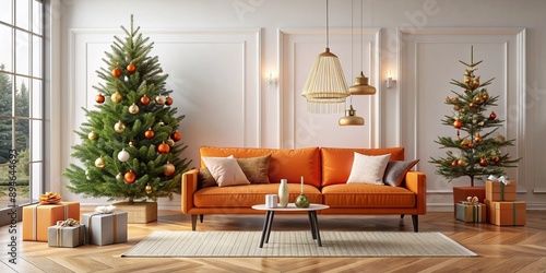Cozy Scandinavian living room with orange sofa against bright white wall, decorative Christmas tree surrounded by gift boxes, festive holiday atmosphere, 3D render.
