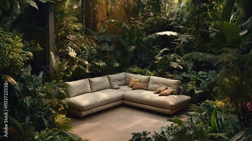 Cozy sectional sofa surrounded by lush tropical plants in nature