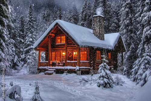 Cozy Snow-Covered Cabin Amidst a Winter Forest