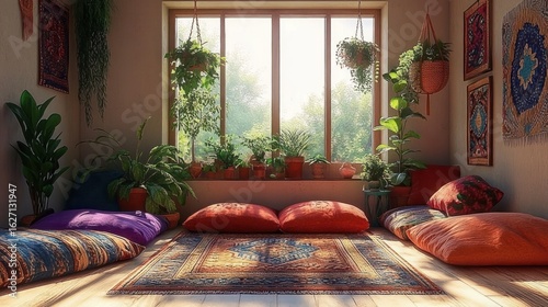 Cozy sunlit room with a window garden, cushions, patterned rugs, and hanging plants creating a warm and inviting atmosphere for relaxation