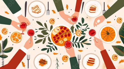 Cozy Thanksgiving dinner setup, with a bountiful feast, autumn decorations, and a family gathered around the table, celebrating gratitude, flat design illustration