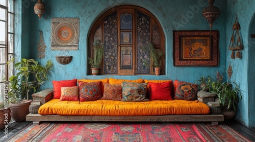 sofa, cushion, plant, wall, artwork, decor, colours, texture, style, rustic, comfort, home, interior, design, ambience, cosy, vibrant, cultural, traditional, pattern, textile, arrangement, lighting, atmosphere, relaxation, warmth, inviting, aesthetic, vintage, eclectic, seating, nature, greenery, window, architecture, space, charme, heritage, wallpainting, art, tranquil, personality, character, detail, layout, harmony, elegance