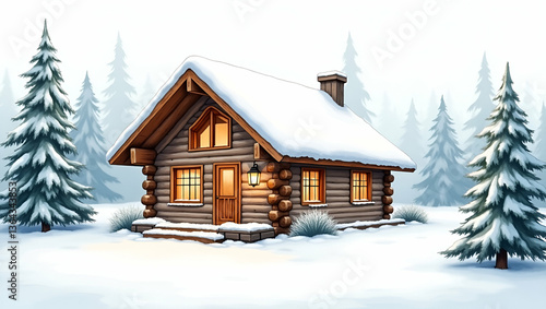 cosy, watercolor, log cabin, snow, clip art, isolated, honed, warm, inviting, winter landscape, design, winter holiday