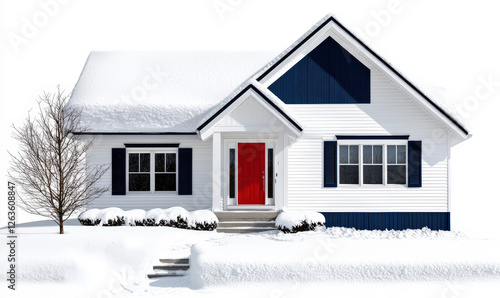 Cozy White House with Red Door Surrounded by Snow in a Winter Wonderland Scene Highlighting a Peaceful Residential Atmosphere