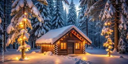 Cozy winter cabin in snow-covered forest with festive lights , Cabin, winter, snow, trees, festive, lights, cozy, holiday