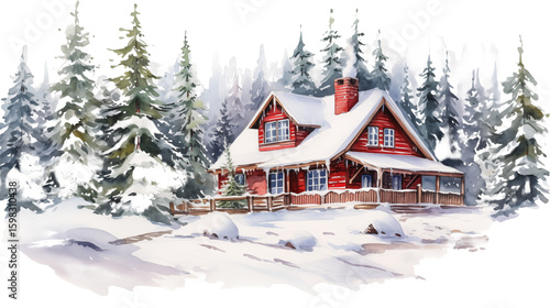 Cozy winter cabin retreat nestled in snowy pine forest, idyllic holiday getaway scene, watercolor illustration