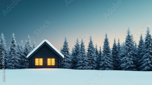 Cozy Winter Cabin Surrounded by Snowy Pine Trees at Dusk with Warm Light Illuminating Windows and Starry Sky