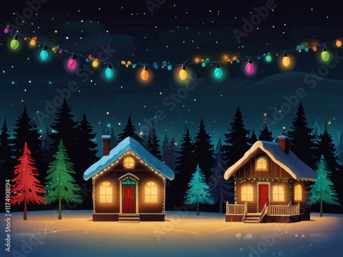 Cozy Winter Cabins, Snowy Night, Christmas Lights