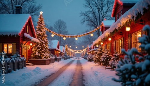 Cozy winter Christmas village scene. Houses with red wooden exterior covered in snow. Decorated with colorful Christmas lights. Christmas trees, garlands. Snowy road. Festive atmosphere. Perfect for