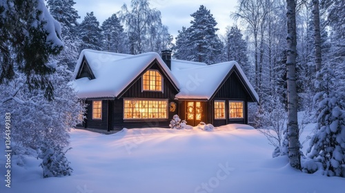 Cozy winter cottage with glowing windows nestled in fresh snow evokes a warm festive atmosphere