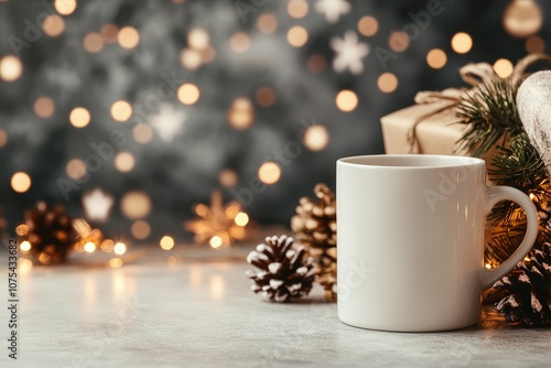 Cozy winter setting with a white mug, pinecones, and festive decorations near a gift box during the holiday season