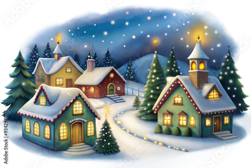 Cozy winter village with snow-covered houses illuminated by warm lights during a tranquil night filled with falling snowflakes isolated on transparent background