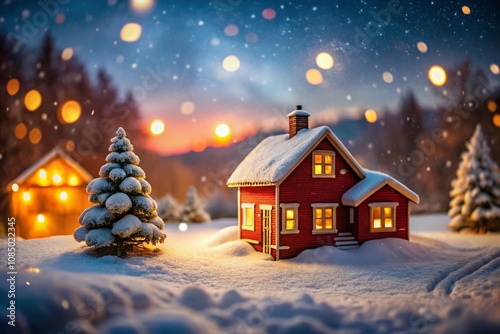 Cozy Winter Wonderland: A Charming Red House Under a Starry Night, Blanketed in Snow, Radiating Warmth and Holiday Cheer in a Tilt-Shift Photography Style