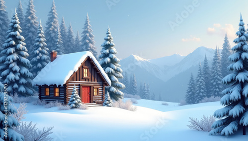 Cozy wooden cabin in a snowy landscape surrounded by pine trees and mountain views