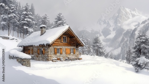 Cozy wooden cabin in a snowy mountain landscape.