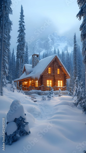 cabin, winter, snow, mountain, tree, forest, night, cosy, warm, light, wooden, log, christmas, holiday, vacation, escape, serene, peaceful, quiet, landscape, nature, scenery, idylli, romantic, rustic, charming, beautiful, artwork, illustration, digital, art, three-dimensional, rendering, snowy, mountain
