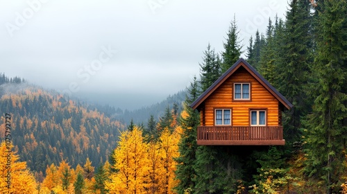 cabin, treehouse, mountain, vale, misty, fog, sunset, fall, autumn, forest, tree, leaf, nature, landscape, scenic, view, picturesque, tranquil, peaceful, serene, cosy, home, retreat, vacation, get-away, relaxation, wilderness, travel, adventure