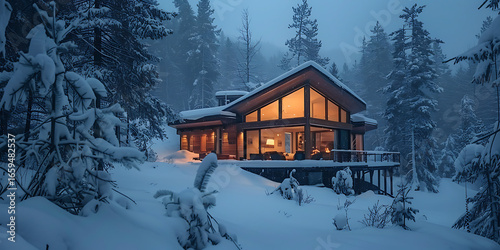 Cozy wooden cabin with illuminated windows in winter snow landscape