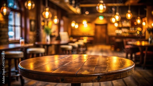 Cozy wooden round table with a soft focus blur background featuring a dimly lit pub atmosphere and warm lighting effects , round
