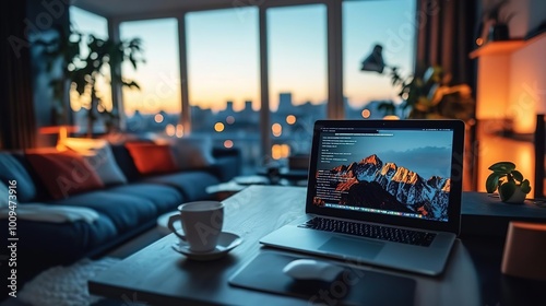 Cozy workspace at dusk featuring a laptop, coffee cup, and soft lighting for productivity and comfort.