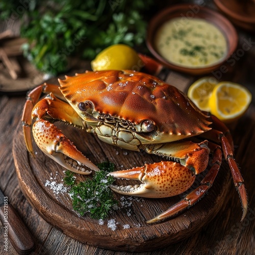 crab, perfectly cooked and plated on a rustic wooden table adorned with lemon slices and seafood sauce