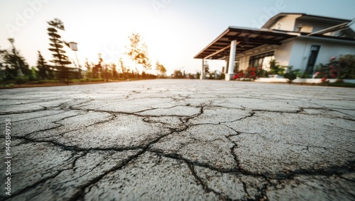 asphalt, road, driveway, crack, house, architecture, home, building, sunset, sun, evening, light, landscape, tree, plant, garden, outdoors, exterior, real estate, property, damage, deterioration, wear, texture, surface, ground, perspective, low angle, detail, background, design, urban, suburb, residential, landscaping, pathway, paseo, concrete, grey, weathered, ageing, natural light, sunlight, shadow